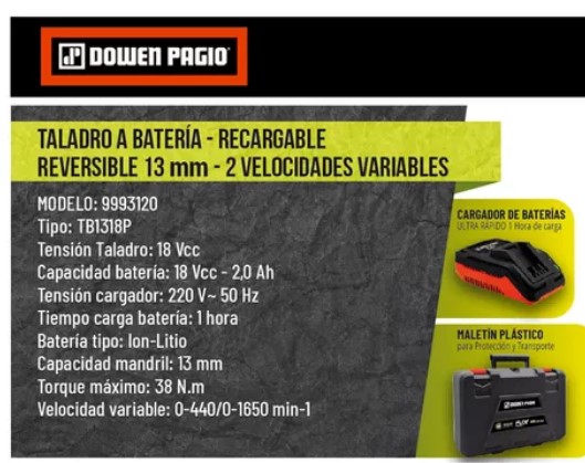 DOWEN PAGIO TALADRO BATERIA 18 VOLT 13 MM 38 NM TORQUE