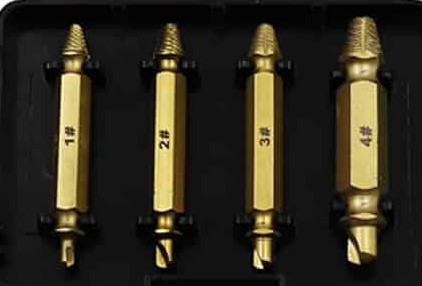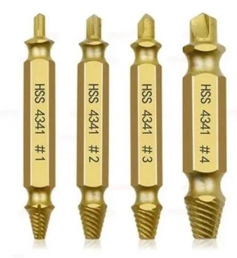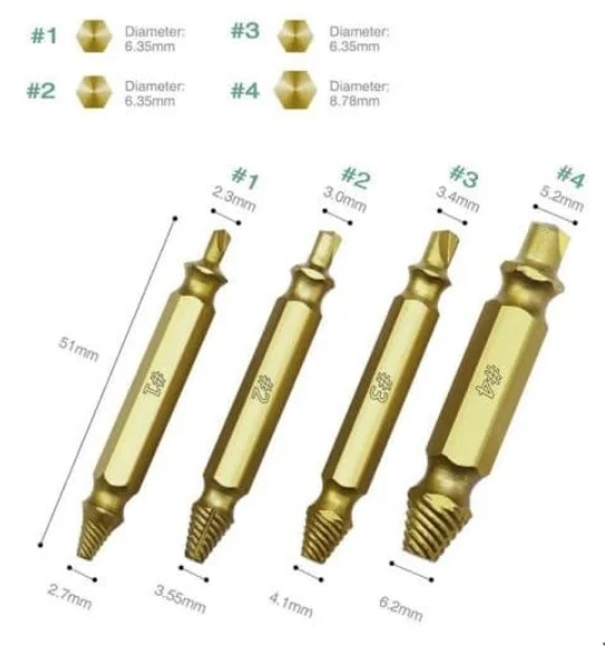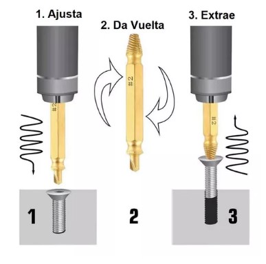 La punta del extremo de perforación comienza un rápido trabajo de fresado y la punta del extremo extractor, es aserrada para mayor agarre y así eliminar fácilmente los pernos y tornillos más difíciles.