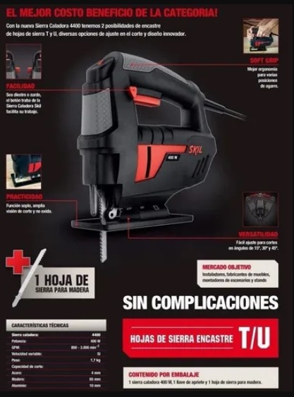 – Incluye: 1 Sierra Caladora 4400, 1 llave de apriete, 1 hoja de madera, 1 manual de instrucciones.