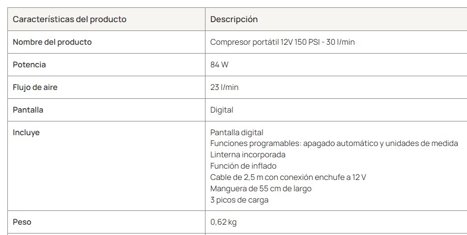 A pesar de su tamaño compacto, este compresor portátil ofrece una gran potencia de 84W, así como un flujo de aire de 23 l/min, lo que significa que puedes inflar tus neumáticos rápidamente y eficientemente, ahorrando tiempo y esfuerzo.